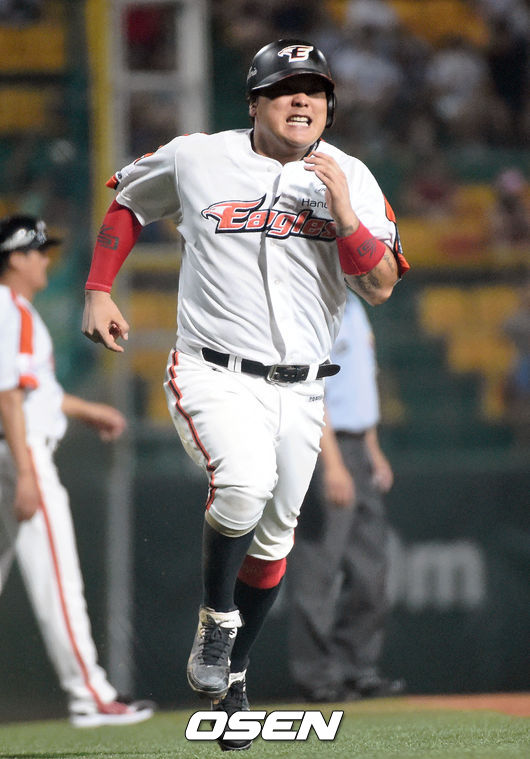 5일 오후 청주 야구장에서 열린 '2014 한국야쿠르트 세븐 프로야구' 한화 이글스와 삼성 라이온즈 경기, 8회말 2사 1루 피에의 우중간 담장을 맞추는 적시타때 1루 주자 김태균 득점을 올리고 있다.