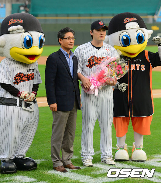 경기에 앞서 KBO 양해영 사무총장이 정대현 통산 600경기 출장시상을 하고 있다 / soul1014@osen.co.kr