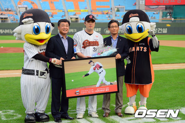 경기에 앞서 KBO 양해영 사무총장이 정대현 통산 600경기 출장시상을 하고 있다 / soul1014@osen.co.kr