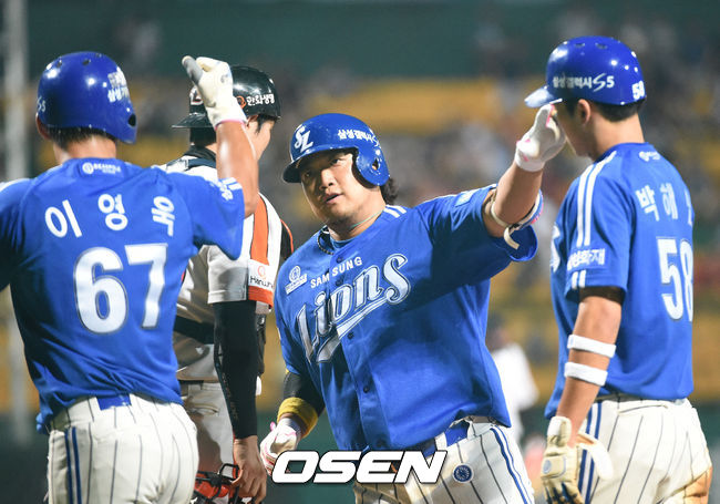 5일 오후 청주 야구장에서 열린 '2014 한국야쿠르트 세븐 프로야구' 한화 이글스와 삼성 라이온즈 경기, 9회초 1사 1,3루 대타 박석민 스리런 홈런을 날리고 홈인 선행주자의 축하를 받고 있다.
