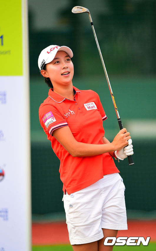 5일 오후 부산 사직구장에서 열린 '2014 한국야쿠르트 세븐 프로야구' 롯데 자이언츠와 NC 다이노스의 경기전 니어핀 대결에서 프로골퍼 김효주가 공을 바라보고 있다