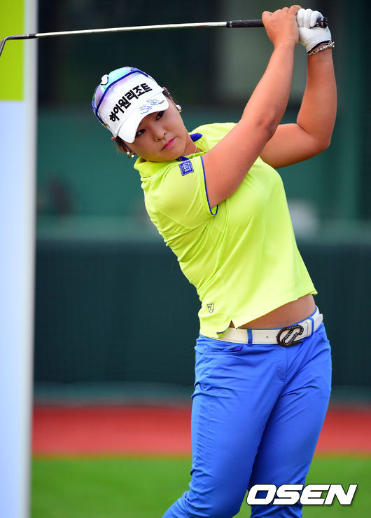 5일 오후 부산 사직구장에서 열린 '2014 한국야쿠르트 세븐 프로야구' 롯데 자이언츠와 NC 다이노스의 경기전 니어핀 대결에서 프로골퍼 조윤지가 티샷을 날리고 있다