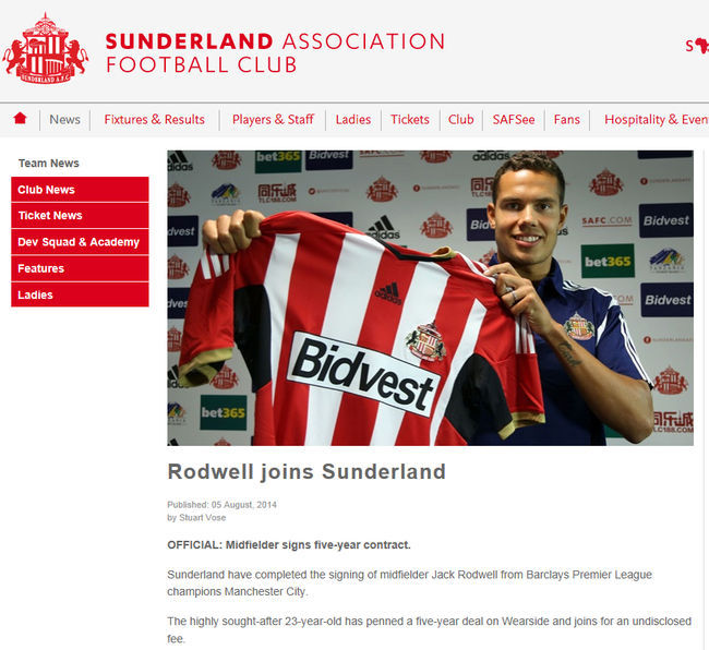 선덜랜드가 미드필더 잭 로드웰(23)의 영입을 공식 발표했다.