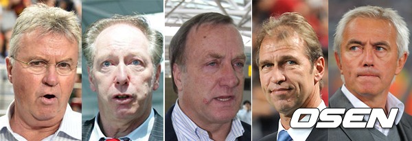 히딩크, 본프레레, 아드보카트, 베어벡, 판 마르바이크(좌부터)