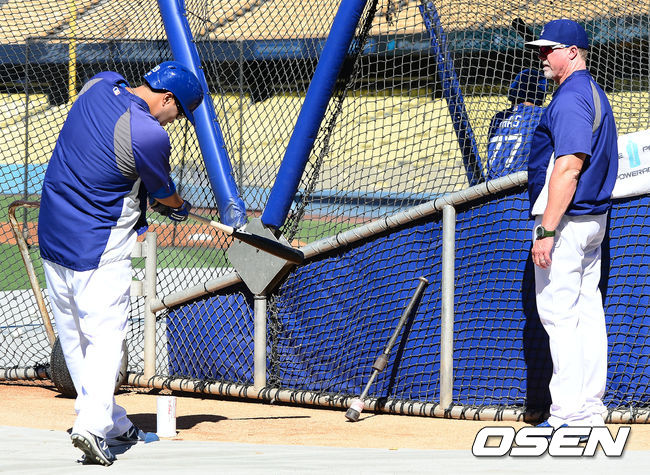 6일(한국시간) 미국 캘리포니아주 로스앤젤레스 다저스타디움에서 열리는 '2014 메이저리그' LA 다저스와 LA 에인절스의 경기에 앞서 다저스 맥과이어 코치가 류현진의 타격폼을 바라보고 있다.