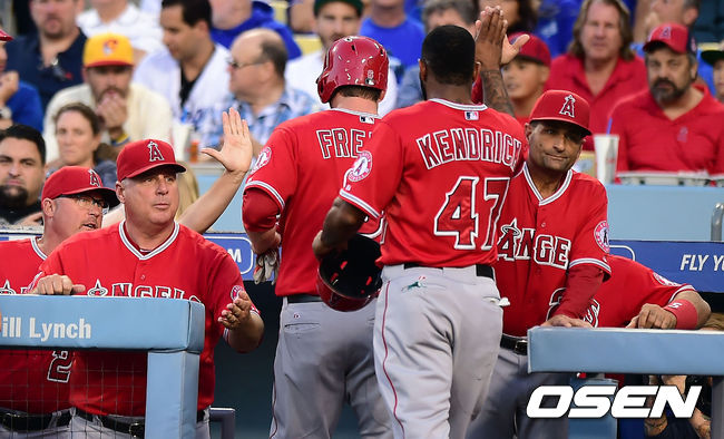 2회초 1사 2,3루 에인절스 프리즈와 켄드릭이 득점을 올린 뒤 기뻐하고 있다.