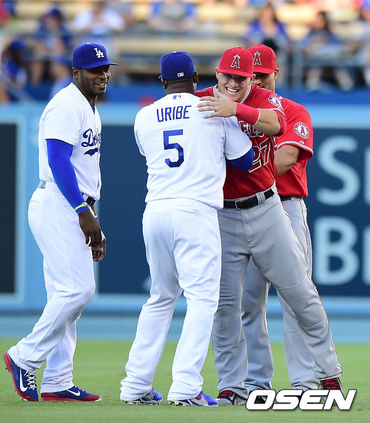 경기에 앞서 다저스 유리베와 에인절스 트라웃이 인사를 나누고 있다.