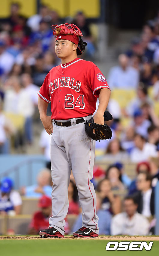 선발 라인업에서 제외된 에인절스 최현이 선발투수의 공을 받아주기위해 그라운드로 나서고 있다.