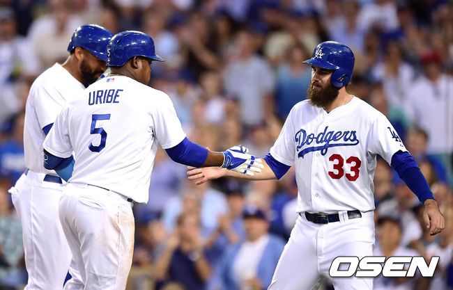 2회말 무사 1,2루 다저스 유리베가 스리런 홈런을 때린 뒤 밴 슬라이크와 기뻐하고 있다.