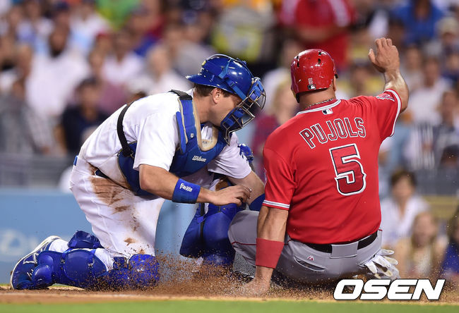 3회초 1사 3루 다저스 A.J 엘리스가 에인절스 켄드릭의 내야 땅볼때 홈을 쇄도하던 푸홀스를 아웃시키고 있다.