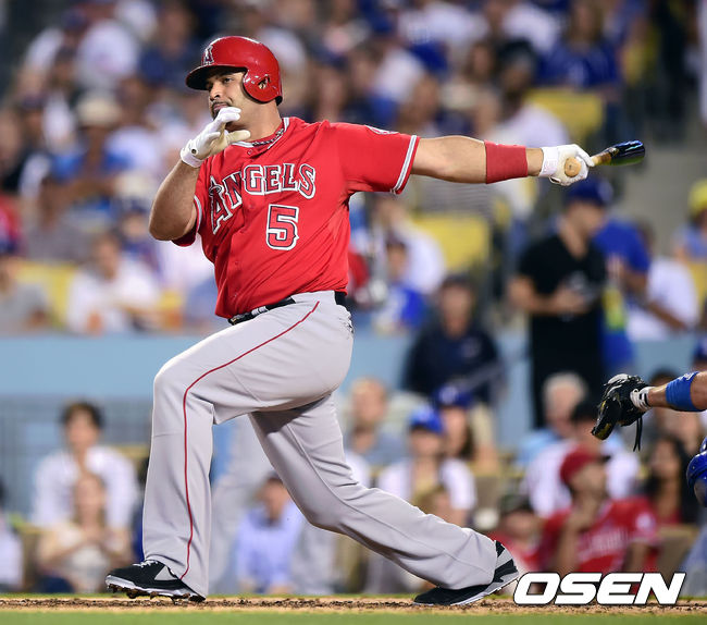 3회초 무사 2루 에인절스 푸홀스가 1타점 적시 2루타를 때리고 있다.
