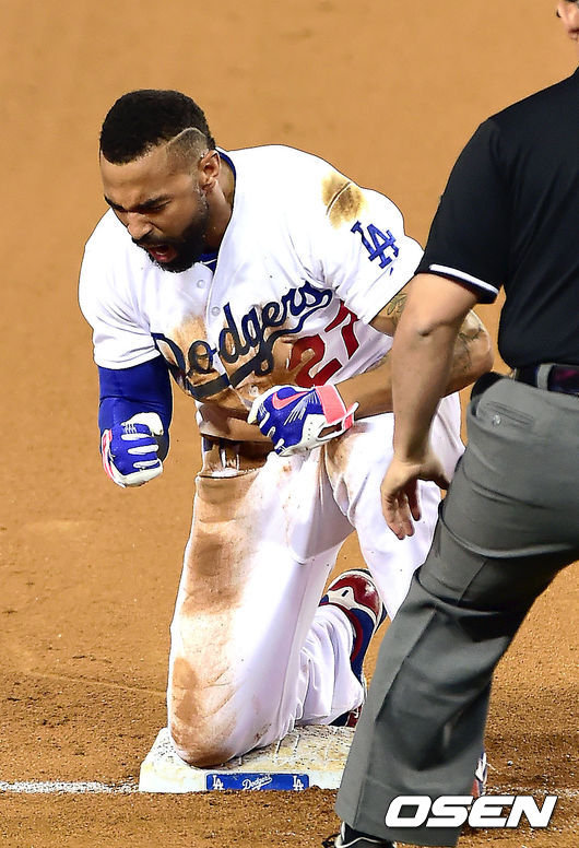 6회말 무사 1루 다저스 맷 켐프가 2루 도루를 시도할때 송구 실책을 틈타 3루까지 진루하고 있다.