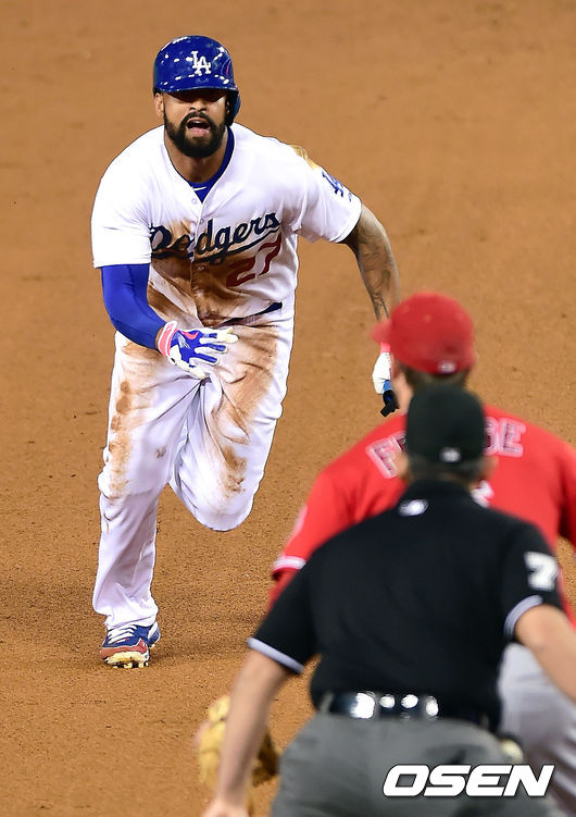 6회말 무사 1루 다저스 맷 켐프가 2루 도루를 시도할때 송구 실책을 틈타 3루까지 진루하고 있다.