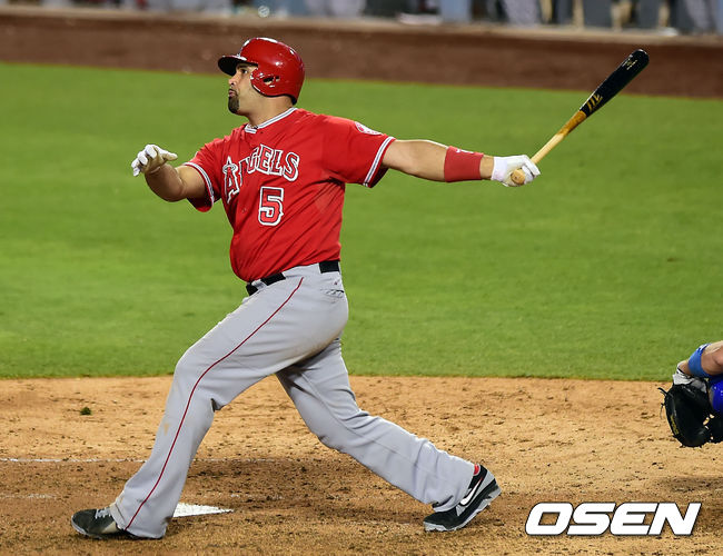 8회초 1사 에인절스 푸홀스가 솔로 홈런을 때리고 있다.
