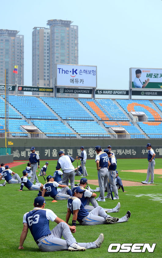 6일 오후 부산 사직구장에서 열리는 2014 한국야쿠르트 세븐 프로야구 롯데 자이언츠와 NC 다이노스의 경기전 NC 선수들이 몸을 풀고 있다.