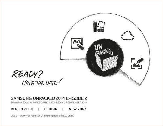 삼성전자는 9월 3일 '삼성 언팩 2014 에피소드2'행사를 개최한다고 글로벌 미디어, 주요 사업자, 개발자 등에 6일(한국시간) 초대장을 보내 알렸다.