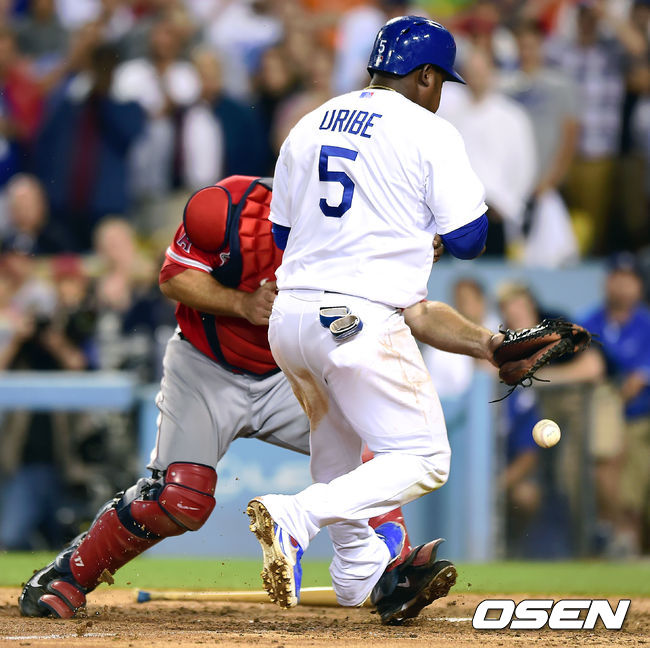 9회말 1사 1,3루 다저스 유리베가 이디어의 3루앞 땅볼때 에인절스 프리즈의 송구실책으로 득점을 올리고 있다./youngrae@osen.co.kr