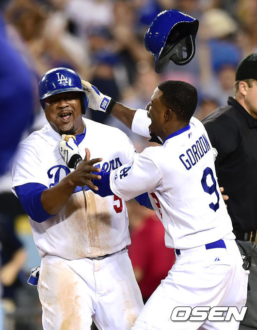 9회말 1사 1,3루 다저스 유리베가 이디어의 3루앞 땅볼때 에인절스 프리즈의 송구실책으로 득점을 올린 뒤 고든과 기뻐하고 있다./youngrae@osen.co.kr