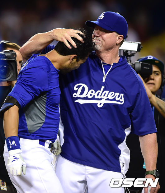 승리를 거둔 다저스 맥과이어 코치가 이디어와 기뻐하고 있다./youngrae@osen.co.kr