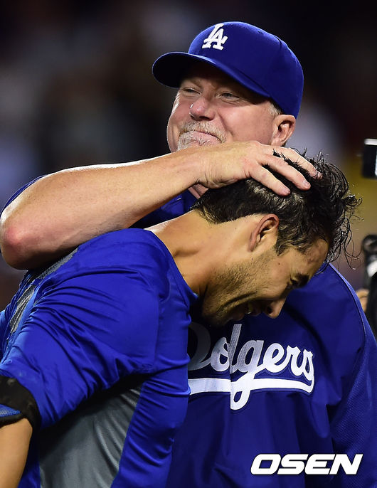 승리를 거둔 다저스 맥과이어 코치가 이디어와 기뻐하고 있다./youngrae@osen.co.kr