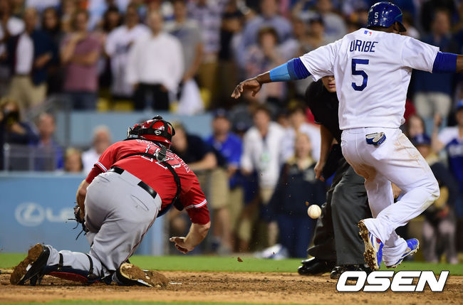 9회말 1사 1,3루 다저스 유리베가 이디어의 3루앞 땅볼때 에인절스 프리즈의 송구실책으로 득점을 올리고 있다./youngrae@osen.co.kr