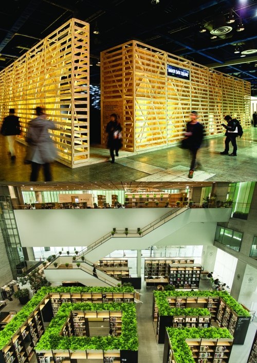 공간 커뮤니케이션의 인테리어 & 컨셉 디자인 부문 베스트 오브 더 베스트 수상작인 ‘네이버 그린팩토리 카페 앤 라이브러리’는 네이버 본사를 찾는 이들이 가장 먼저 접하는 사옥 1,2층에 위치한 도서관이다. 누구나 입장해 다양한 주제의 잡지와 디자인 및 IT 전문서적, 백과사전을 열람할 수 있어, 누구나 접속해 다양한 정보를 찾을 수 있는 온라인 공간인 네이버를 효과적으로 형상화했다.