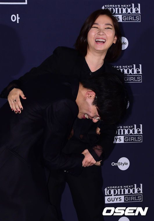 6일 오후 서울 도산대로에 위치한 CGV 청담 씨네시티에서 열린 온스타일 '도전 수퍼모델 코리아 GUYS & GIRLS'(도수코 가이즈앤걸스) 제작발표회에서 장윤주와 김원중이 장난을 치고 있다.