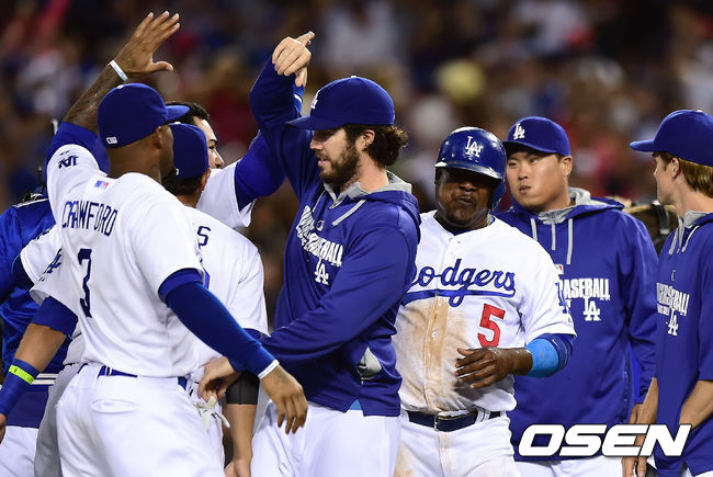 승리를 거둔 다저스 류현진과 동료들이 기뻐하고 있다./youngrae@osen.co.kr