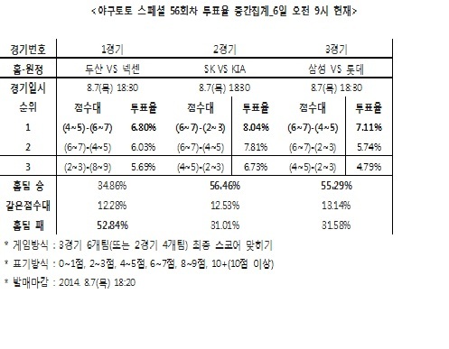 KBO 3경기 대상 야구토토 스페셜 56회차 투표율 중간집계