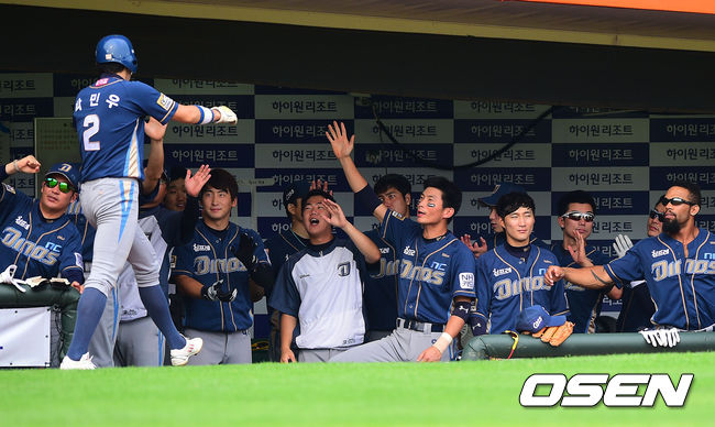 6일 오후 부산 사직구장에서 열린 2014 한국야쿠르트 세븐 프로야구 롯데 자이언츠와 NC 다이노스의 경기, 5회초 2사 1루 NC 권희동의 역전 1타점 적시타때 1루 주자 박민우가 홈을 밟은 후 동료들의 축하를 받고 있다.