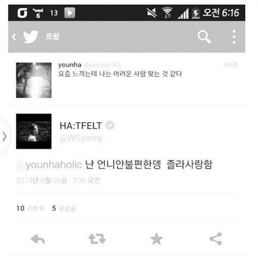 공개된 사진 속 윤하와 예은이 트위터를 통해 대화를 나눈 내용이 담겨있다. 윤하는 “요즘 느끼는데 나는 어려운 사람 맞는 것 같다”라며 심오한 글을 남겼다. 이에 예은은 “난 언니 안 불편한데. 매우 사랑함”라고 답하며 격한 애정을 표현해 웃음을 자아낸다.