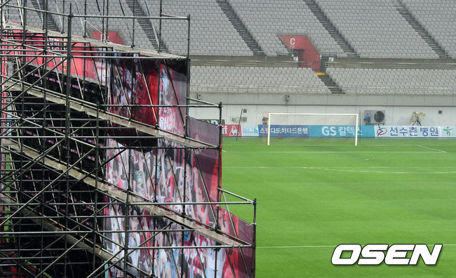 한편 이달 9일과 10일 열리는 콘서트 준비 때문에 본부석 맞은 편인 E석에 아무도 앉을 수 없다. 콘서트 무대 설치로 인해 관중 입장이 통제되고 E석은 전체가 통천으로 가려졌다./ jpnews@osen.co.kr
