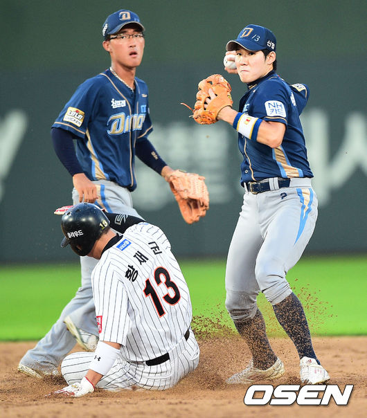 6일 오후 부산 사직구장에서 열린 2014 한국야쿠르트 세븐 프로야구 롯데 자이언츠와 NC 다이노스의 경기, 2회말 무사 1,2루 롯데 전준우의 병살타때 NC 박민우 2루수가 1루 주자 황재균을 포스아웃 시킨뒤 1루로 송구하고 있다