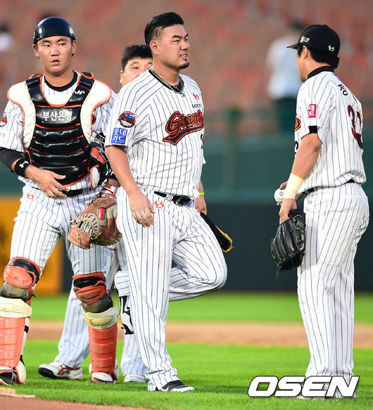 6일 오후 부산 사직구장에서 열린 2014 한국야쿠르트 세븐 프로야구 롯데 자이언츠와 NC 다이노스의 경기, 3회초 무사 1루 NC 박민우의 강습타구를 다리에 맞은 롯데 선발투수 송승준이 고통스러워하고 있다. 1루 주자 이태원을 아웃.
