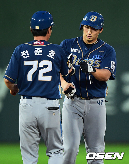 6일 오후 부산 사직구장에서 열린 2014 한국야쿠르트 세븐 프로야구 롯데 자이언츠와 NC 다이노스의 경기, 3회초 1사 1,2루 NC 나성범이 선취 1타점 2루타를 날리고 전준호 코치에게 장비를 전달하고 있다.