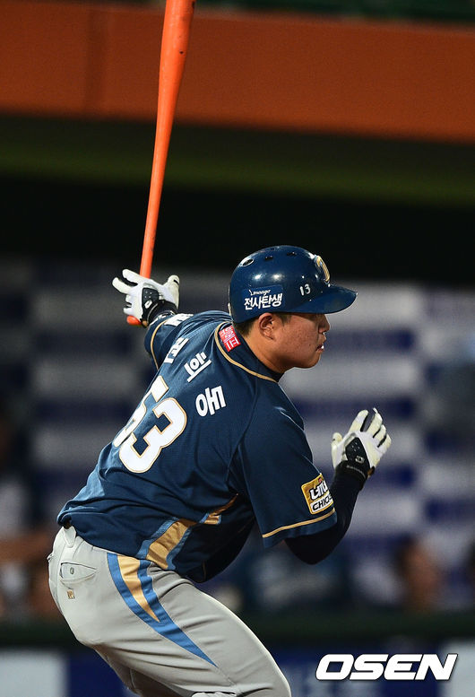 6일 오후 부산 사직구장에서 열린 2014 한국야쿠르트 세븐 프로야구 롯데 자이언츠와 NC 다이노스의 경기, 3회초 2사 2,3루 NC 권희동이 1타점 적시타를 날리고 있다