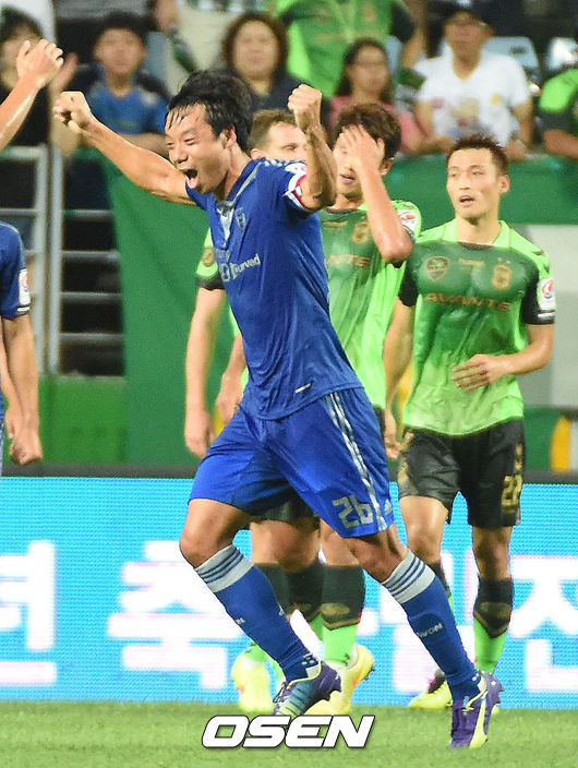 6일 오후 전주월드컵경기장에서 열린 전북 현대와 수원 삼성의 '현대오일뱅크 K리그 클래식 2014' 19라운드 경기,전반 수원 염기훈이 동점골을 성공시키며 환호하고 있다.