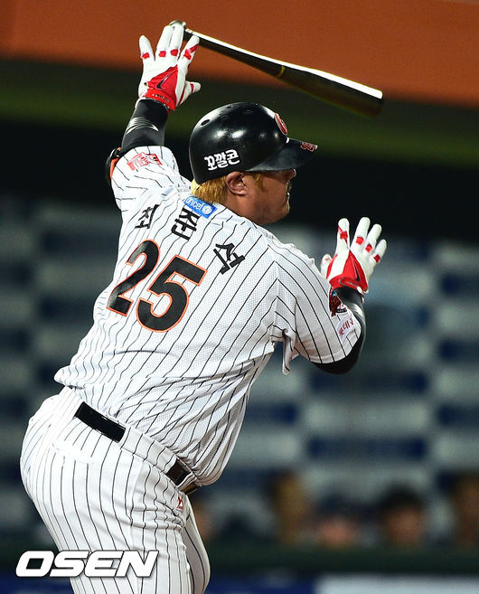 6일 오후 부산 사직구장에서 열린 2014 한국야쿠르트 세븐 프로야구 롯데 자이언츠와 NC 다이노스의 경기, 3회초 무사 만루 롯데 최준석이 1타점 적시타를 날리고 있다