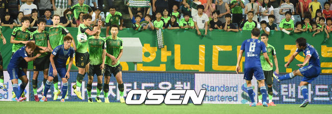 6일 오후 전주월드컵경기장에서 열린 전북 현대와 수원 삼성의 '현대오일뱅크 K리그 클래식 2014' 19라운드 경기, 전반 수원 염기훈이 동점 프리킥을 성공시키고 있다.