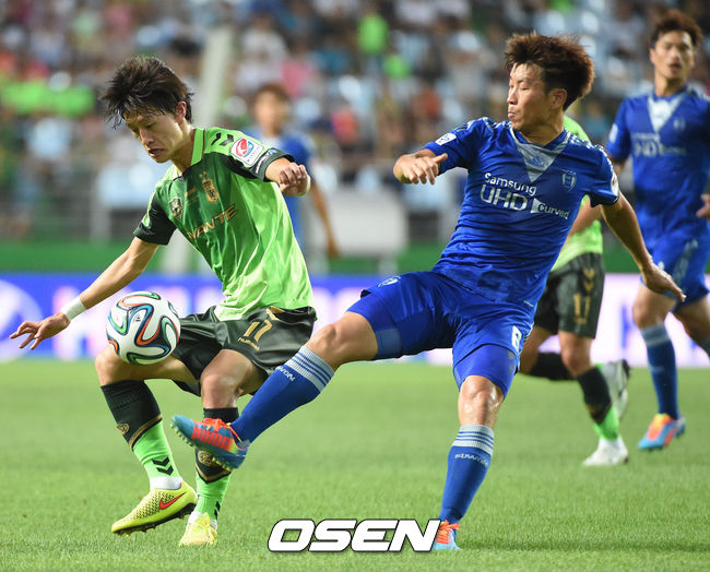 6일 오후 전주월드컵경기장에서 열린 전북 현대와 수원 삼성의 '현대오일뱅크 K리그 클래식 2014' 19라운드 경기,후반 전북 현대 이재성이 수원 삼성 김두현의 파울에 걸려 넘어지고 있다.
