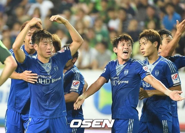 6일 오후 전주월드컵경기장에서 열린 전북 현대와 수원 삼성의 '현대오일뱅크 K리그 클래식 2014' 19라운드 경기,후반 수원 삼성 김두현이 역전골을 성공시키며 환호하고 있다.