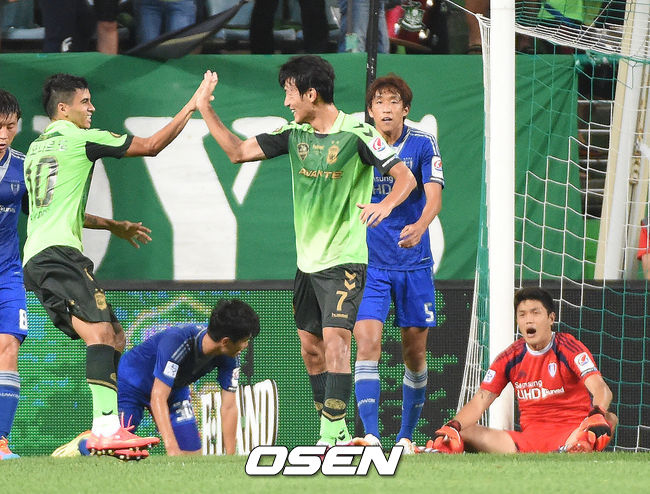 6일 오후 전주월드컵경기장에서 열린 전북 현대와 수원 삼성의 '현대오일뱅크 K리그 클래식 2014' 19라운드 경기,후반 전북현대 한교원이 동점골을 성공시키며 환호하고 있다.