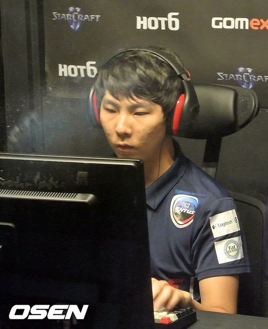 CJ 김정우는 6일 서울 대치동 곰eXP스튜디오서 열린 '2014 핫식스 GSL 시즌3 코드S(이하 GSL)' 32강 A조 개막전 승자전에서 진에어 김유진을 2-1로 제압하고 조 1위로 올라가는 이변을 연출했다.
