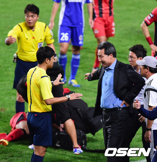 후반 울산 카사가 퇴장 당하자 조민국 감독이 불만을 나타내고 있다.