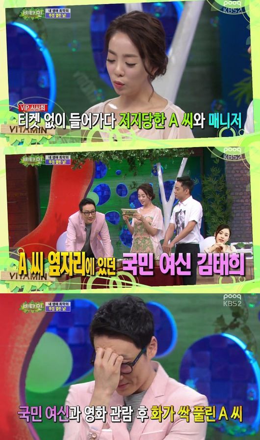 이날 박은영 아나운서는 이휘재 매니저의 사연이라며 "영화 VIP 시사회에 갔다. 연예인은 얼굴이 티켓이니까 들어갈 줄 알았는데 표를 받아야 해서 빨리 표를 받아 들어갔다"며 "그런데 엉뚱한 상영관으로 가서 헤매다가 상영관을 제대로 찾아갔다"고 전했다.