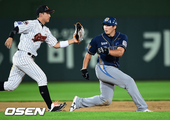 6일 오후 부산 사직구장에서 열린 2014 한국야쿠르트 세븐 프로야구 롯데 자이언츠와 NC 다이노스의 경기, 7회초 1사 2루 NC 권희동의 내야땅볼때 협살 거린 나성범이 황재균 3루수에게 태그아웃되고 있다.