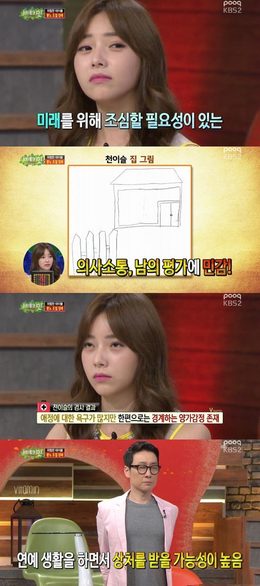 경희대병원 정신건강의학과 백종우 교수는 "애정에 대한 욕구가 많지만 한편으로는 경계하는 양가감정이 존재한다"며 "연예생활을 하면서 상처받을 가능성이 높다. 일에 대해서는 조심할 필요가 있다"고 설명했다.