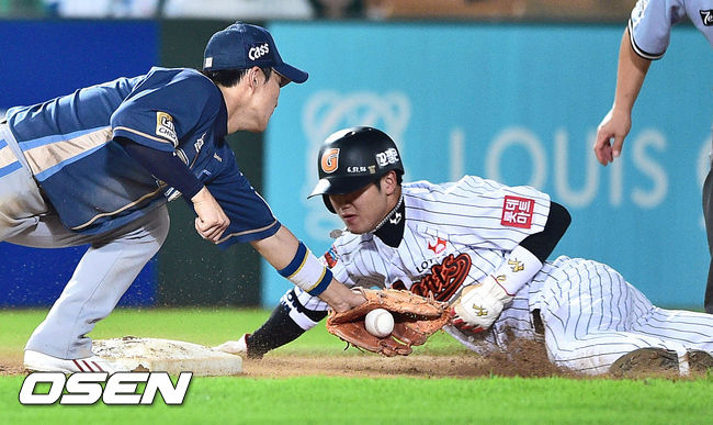 6일 오후 부산 사직구장에서 열린 2014 한국야쿠르트 세븐 프로야구 롯데 자이언츠와 NC 다이노스의 경기, 7회말 2사 1루 롯데 손아섭의 타석때 폭투로 3루까지 진루하던 1루 주자 임종혁이 NC 이상호 3루수에게 태그아웃되고 있다