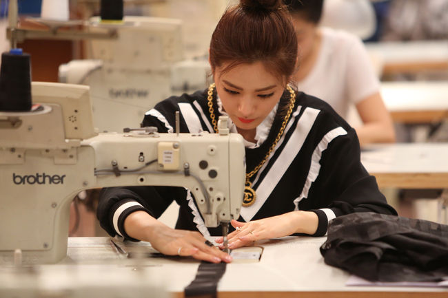 공개된 사진 속 나나는 진지한 표정으로 재봉틀을 돌리며 직접 바느질을 하고 있다.