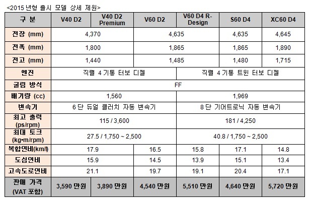 볼보자동차코리아가 2015년형 V40, V60, S60, XC60을 7일 출시했다. 국내 소비자들이 선호하는 첨단 안전 및 편의 시스템을 더해 상품성을 강화했지만 가격 인상은 없다.